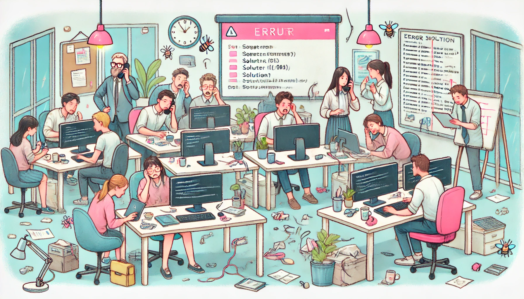 크고 작은 버그를 잡는 프로그래머, 애매하게 시간이 남아서 쉬거나 잠시 잡담을 하는 사람들